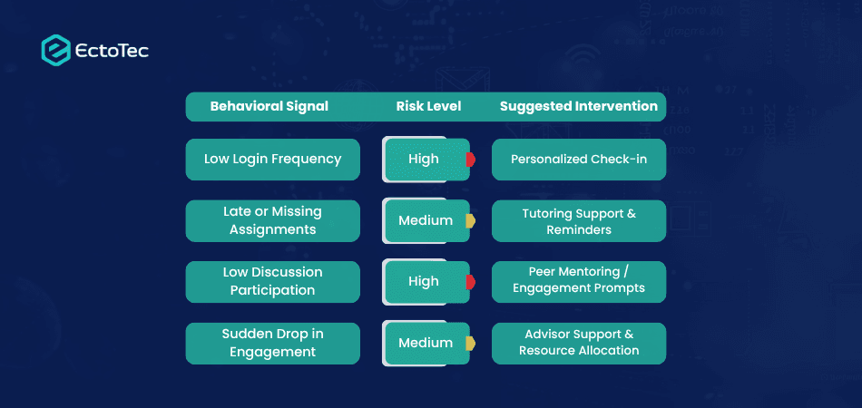 To make these insights actionable, institutions can map specific behavioral patterns to risk levels and corresponding interventions. The table below highlights some of the most important indicators and how educators can respond.