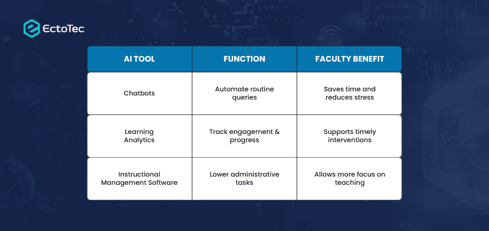 Artificial intelligence-powered tools and current LMS systems are revolutionizing higher education by lowering faculty workload, boosting teaching quality, and enabling tailored learning experiences. Strategic use of faculty support technology, integration with LMS platforms, and extensive training allow educators to focus on high-impact teaching and mentoring. These technologies help professors rather than replace them, resulting in more efficient, inclusive, and student-focused learning environments. Institutions that use AI and digital teaching solutions intelligently can increase faculty well-being, minimize fatigue, and stimulate innovation, ultimately improving outcomes for students as well as teachers