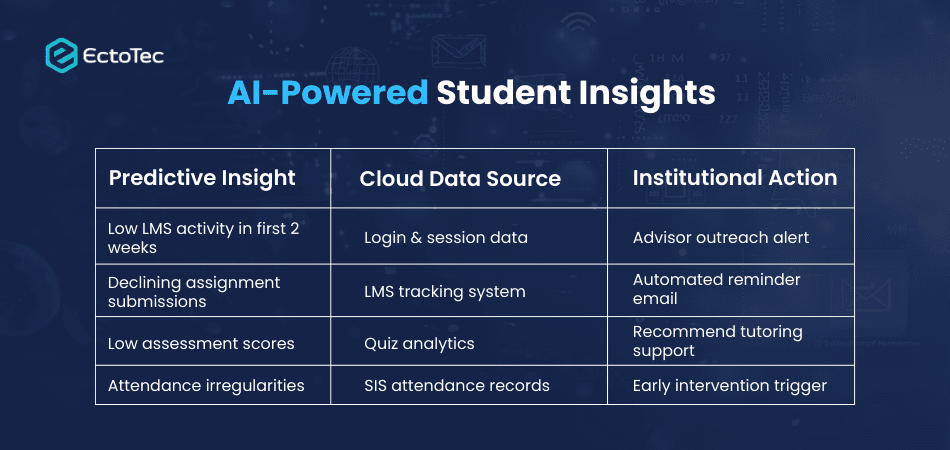 Para obtener una visión más clara del funcionamiento de la IA en un contexto de LMS y SIS primero en la nube, es útil examinar cómo los datos de compromiso se convierten en intervenciones accionables. Los siguientes ejemplos demuestran cómo la analítica predictiva transforma los patrones de comportamiento estudiantil en respuestas proactivas por parte de la institución.